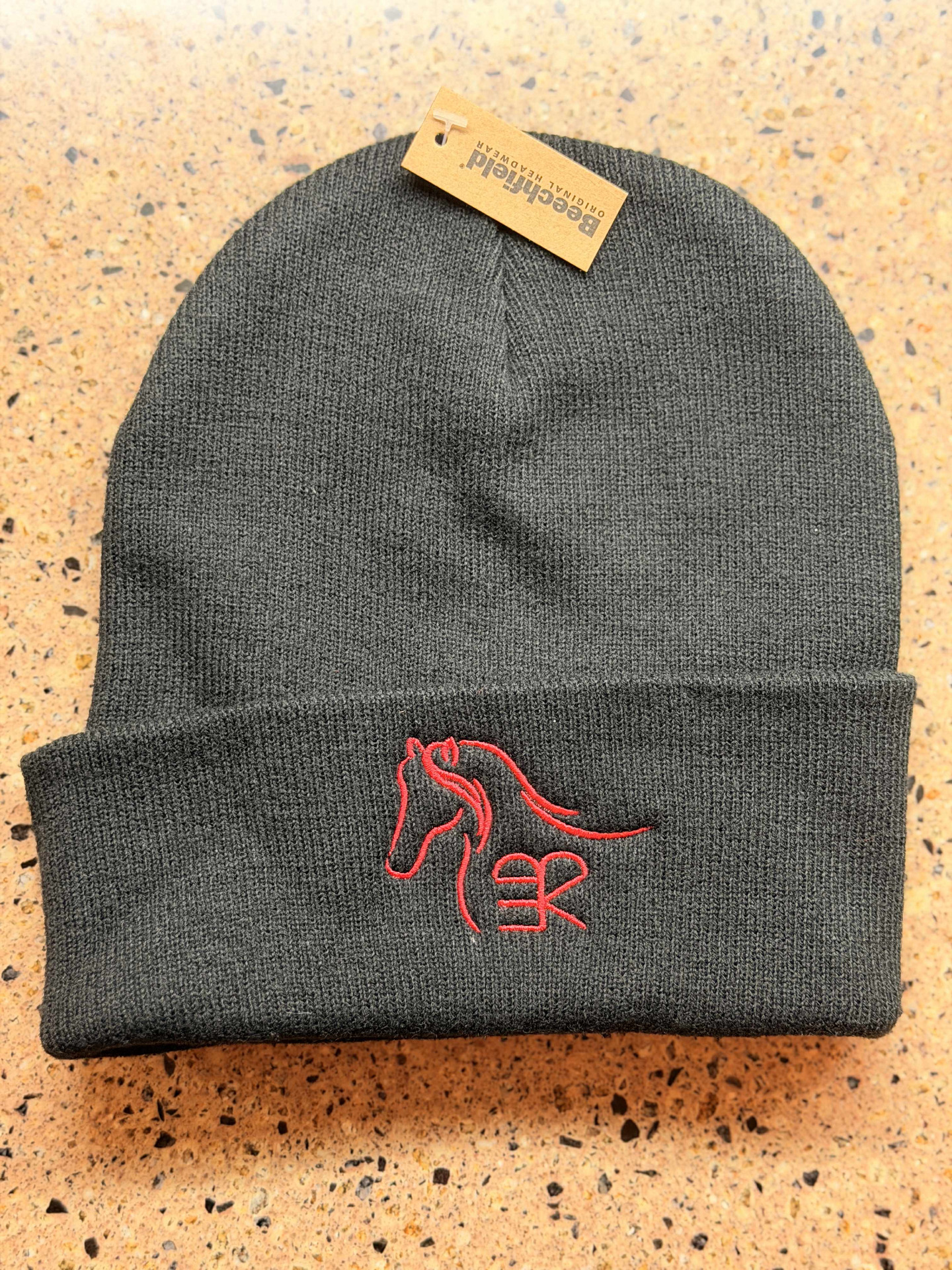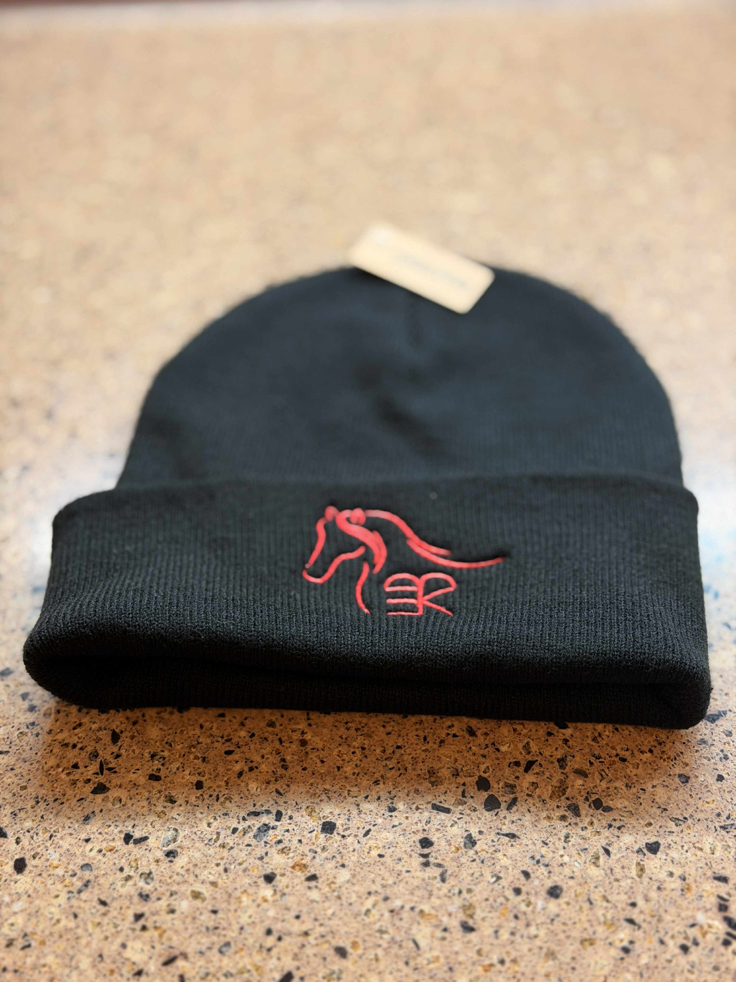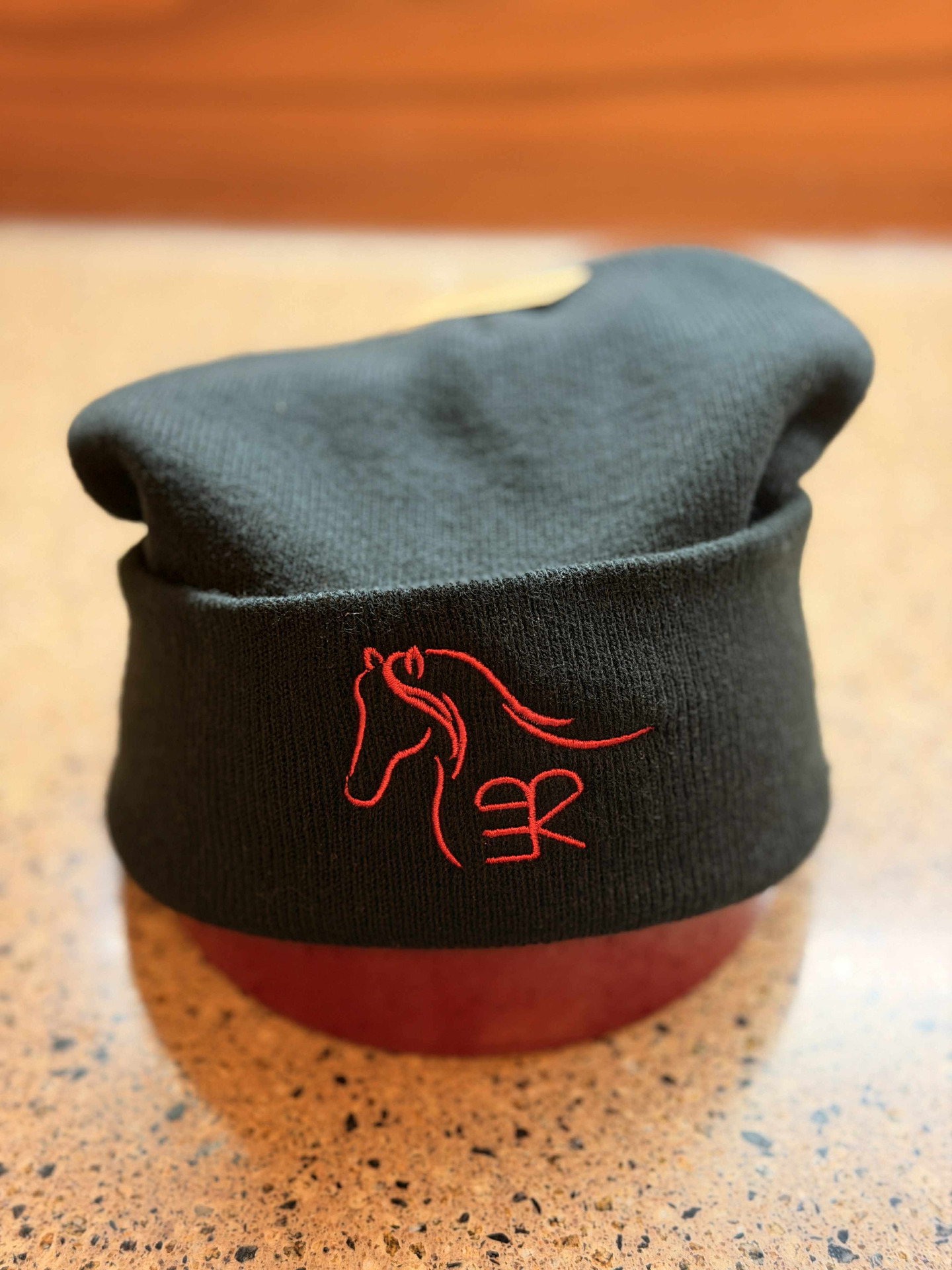 Černá pletená čepice s lemem, červená výšivka s novým logem karačajevského koníka. Velikost Unisex, padne "každé" hlavičce.